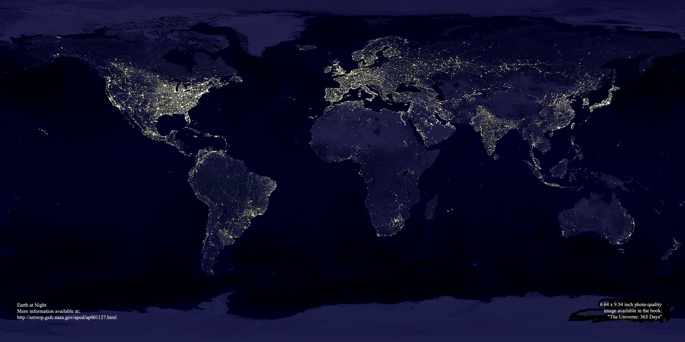 The Earth at night....it is a larg photo, copy it and zoom in to different parts of the world.